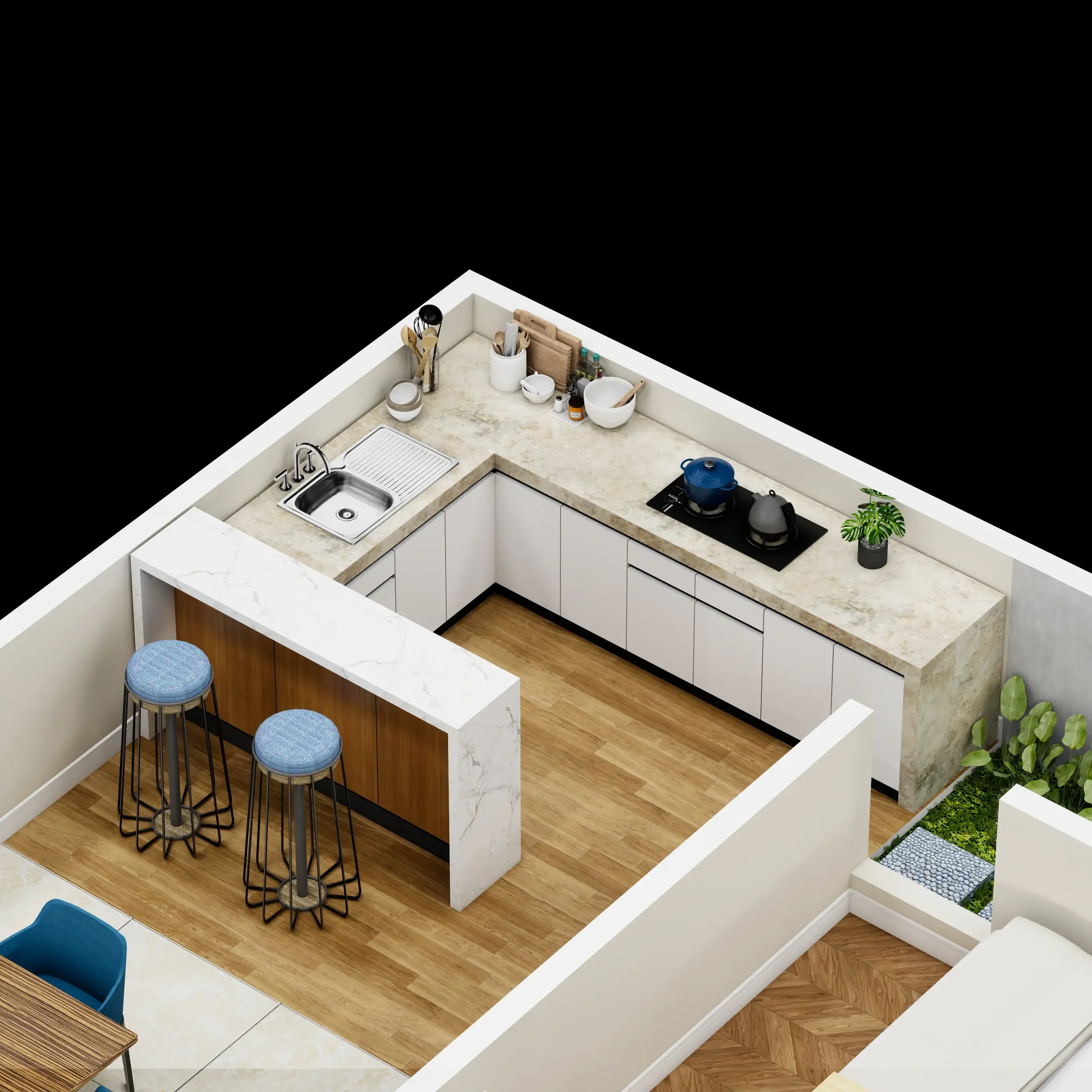 | Peninsula | Open-plan homes | Added seating & prep area |